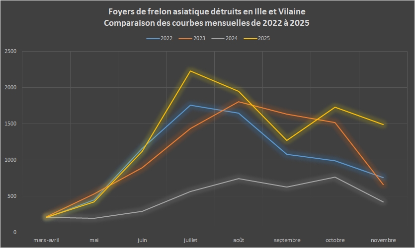 L’intensité du programme 2025 de lutte contre le frelon asiatique en Ille et Vilaine se résume de la manière suivante :